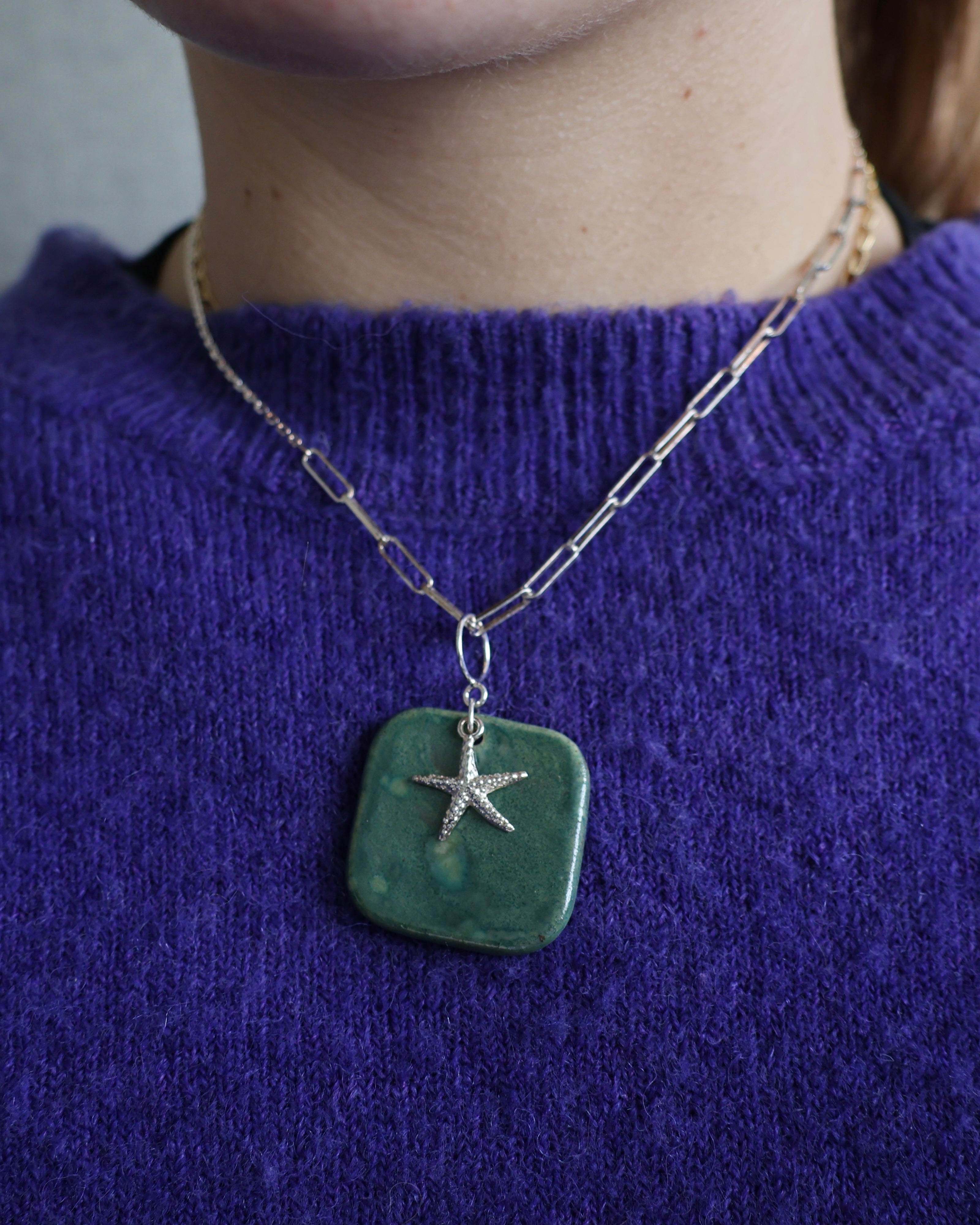 Chaque collier est une pièce unique, façonnée à la main en céramique dans notre atelier, révélant des nuances et des textures singulières propres au geste artisanal. La pièce de céramique, au caractère affirmé, est suspendue à une chaîne en gold-filled — un argent doré à l’or 18k — qui apporte éclat, finesse et durabilité.