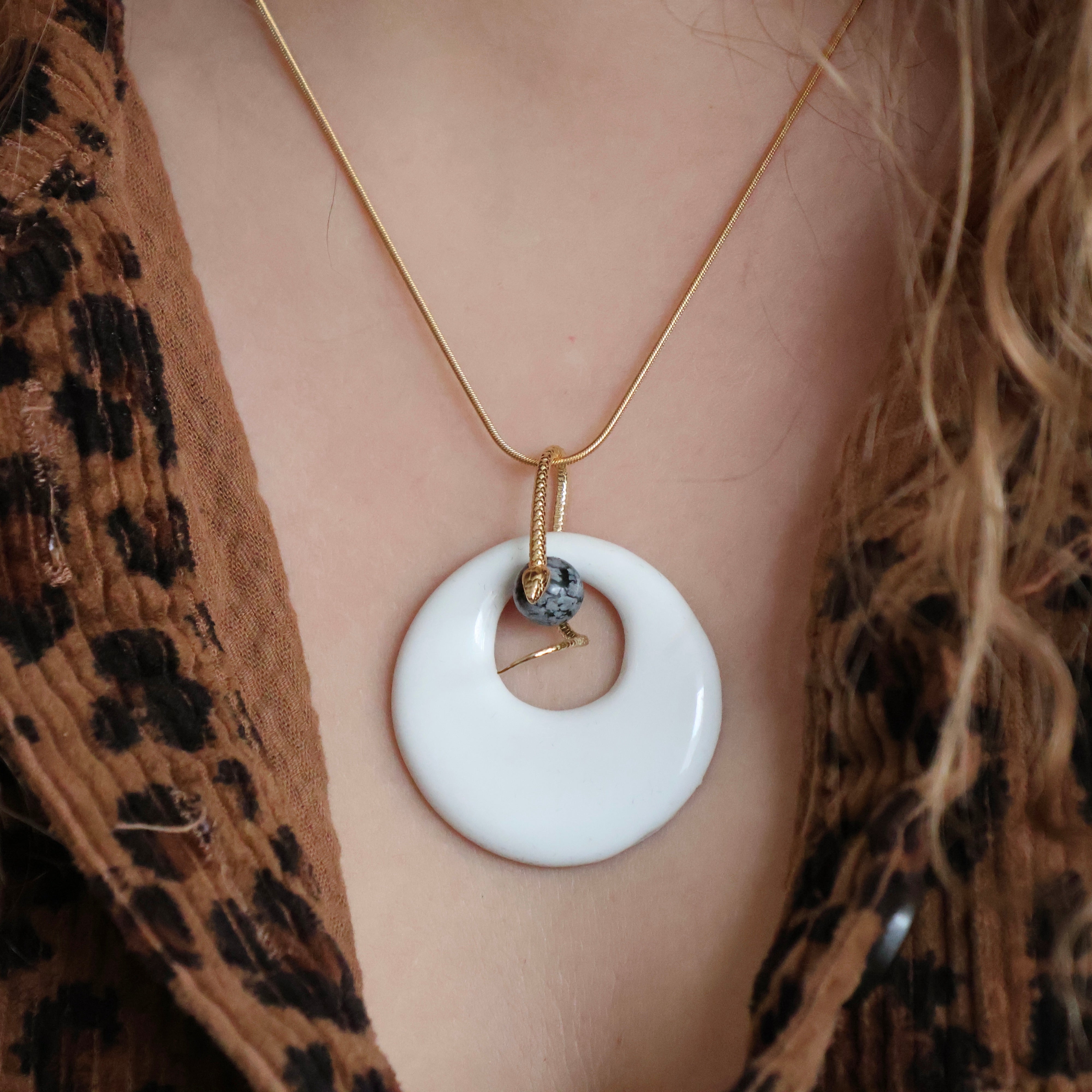 Façonné à la main dans notre atelier, ce collier réunit la douceur de la céramique artisanale et la noblesse des matériaux naturels. Le pendentif, modelé pièce par pièce, accueille une pierre naturelle maintenue par un serpent doré. L’ensemble est suspendu à une chaîne en gold filled, un alliage d’argent recouvert d’or 18k.