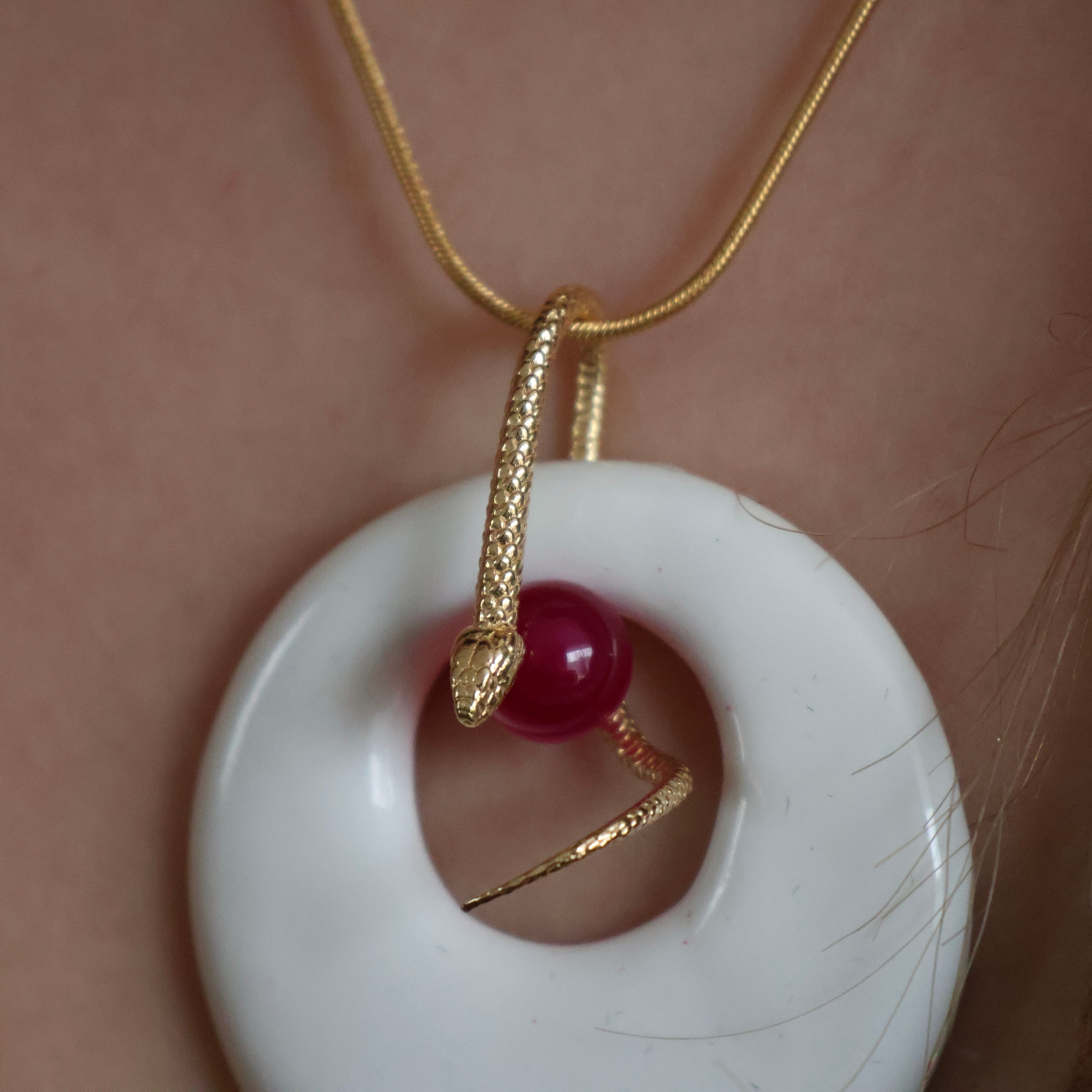 Façonné à la main dans notre atelier, ce collier réunit la douceur de la céramique artisanale et la noblesse des matériaux naturels. Le pendentif, modelé pièce par pièce, accueille une pierre naturelle maintenue par un serpent doré. L’ensemble est suspendu à une chaîne en gold filled, un alliage d’argent recouvert d’or 18k.