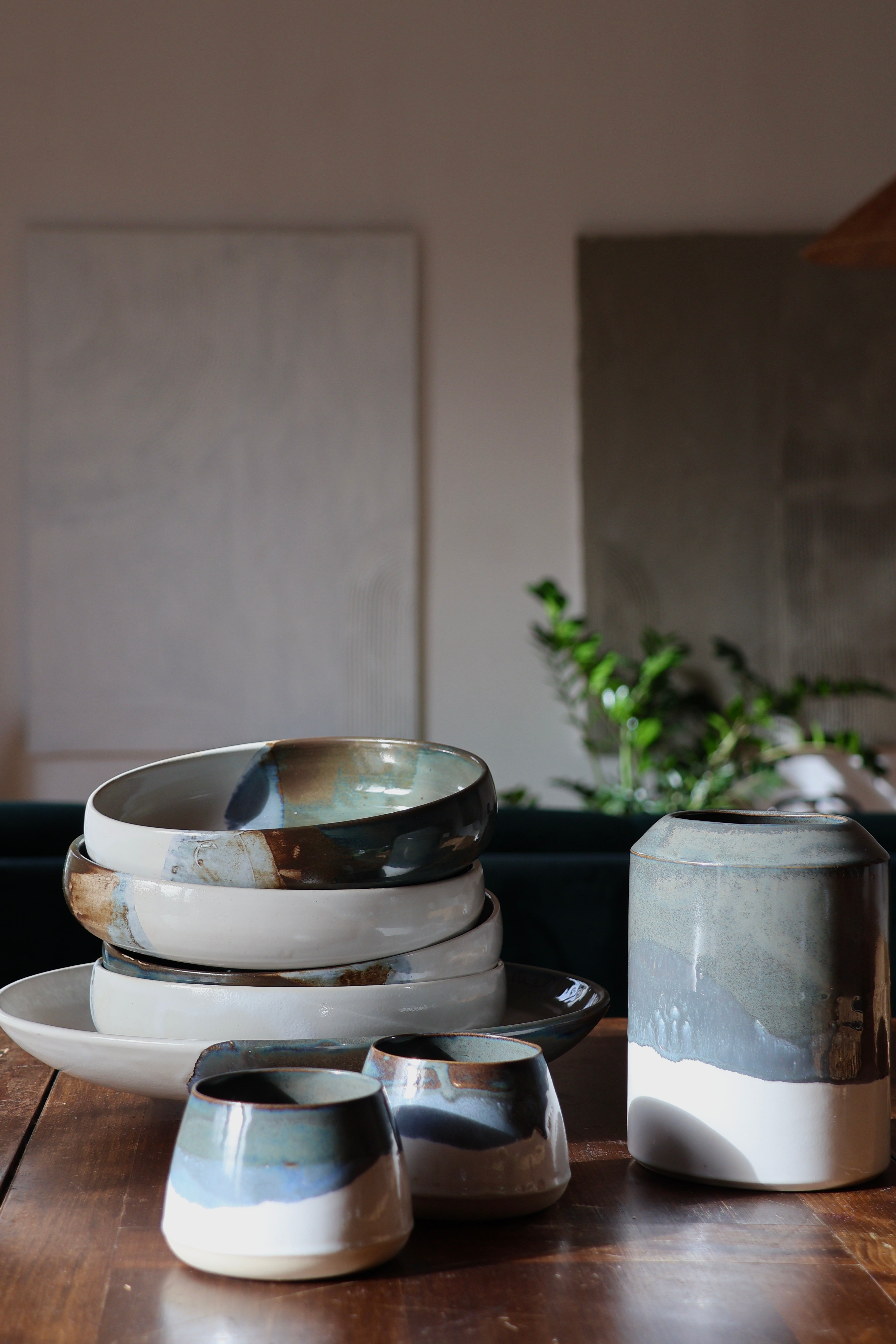 Le vase rivage est façonné à la main dans nos ateliers de Pau. Haut de 15 cm et posé sur une base de 11 cm de large, ces lignes simples et sa présence sculpturale mettent en valeur les nuances de son émail.