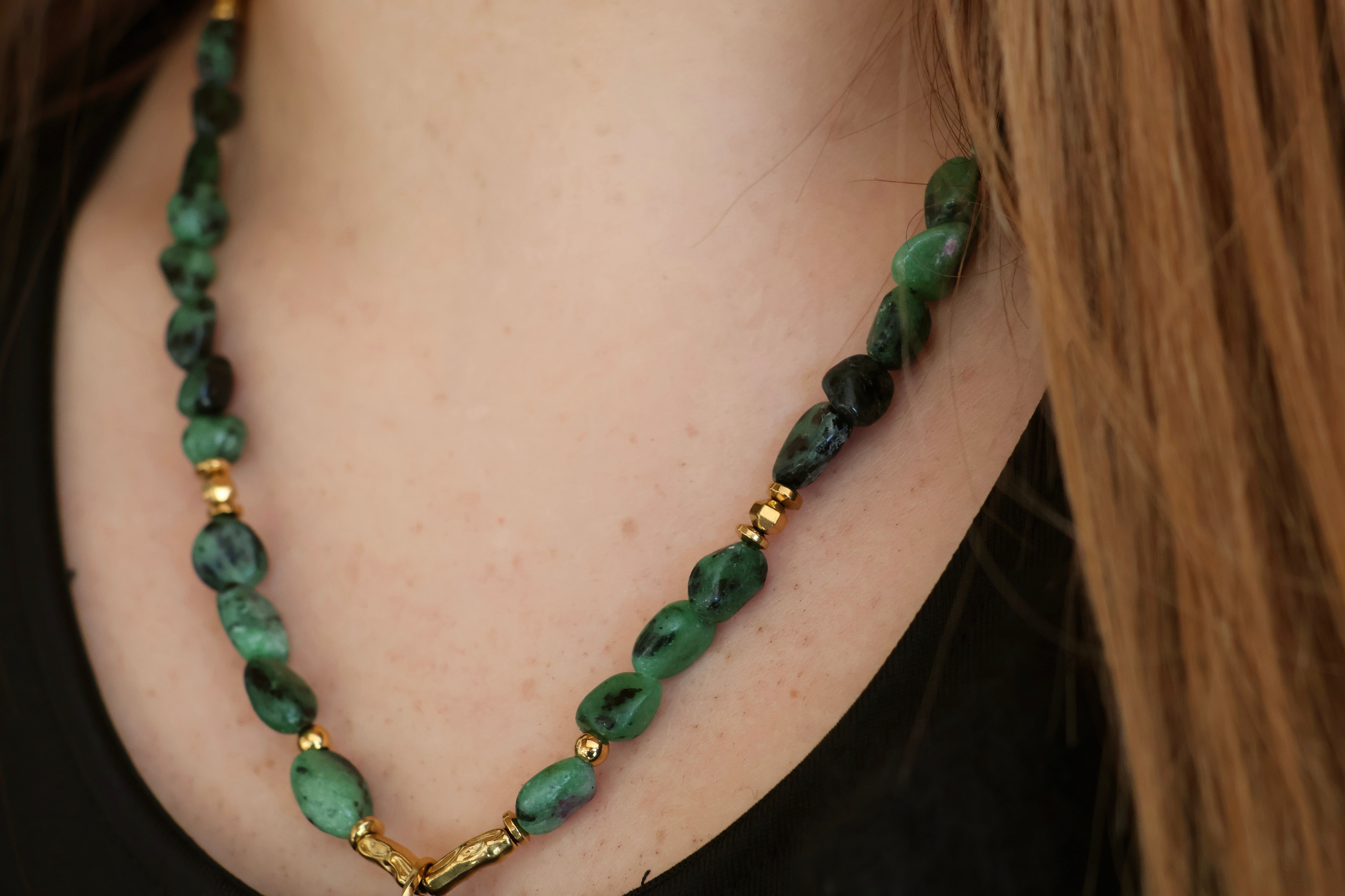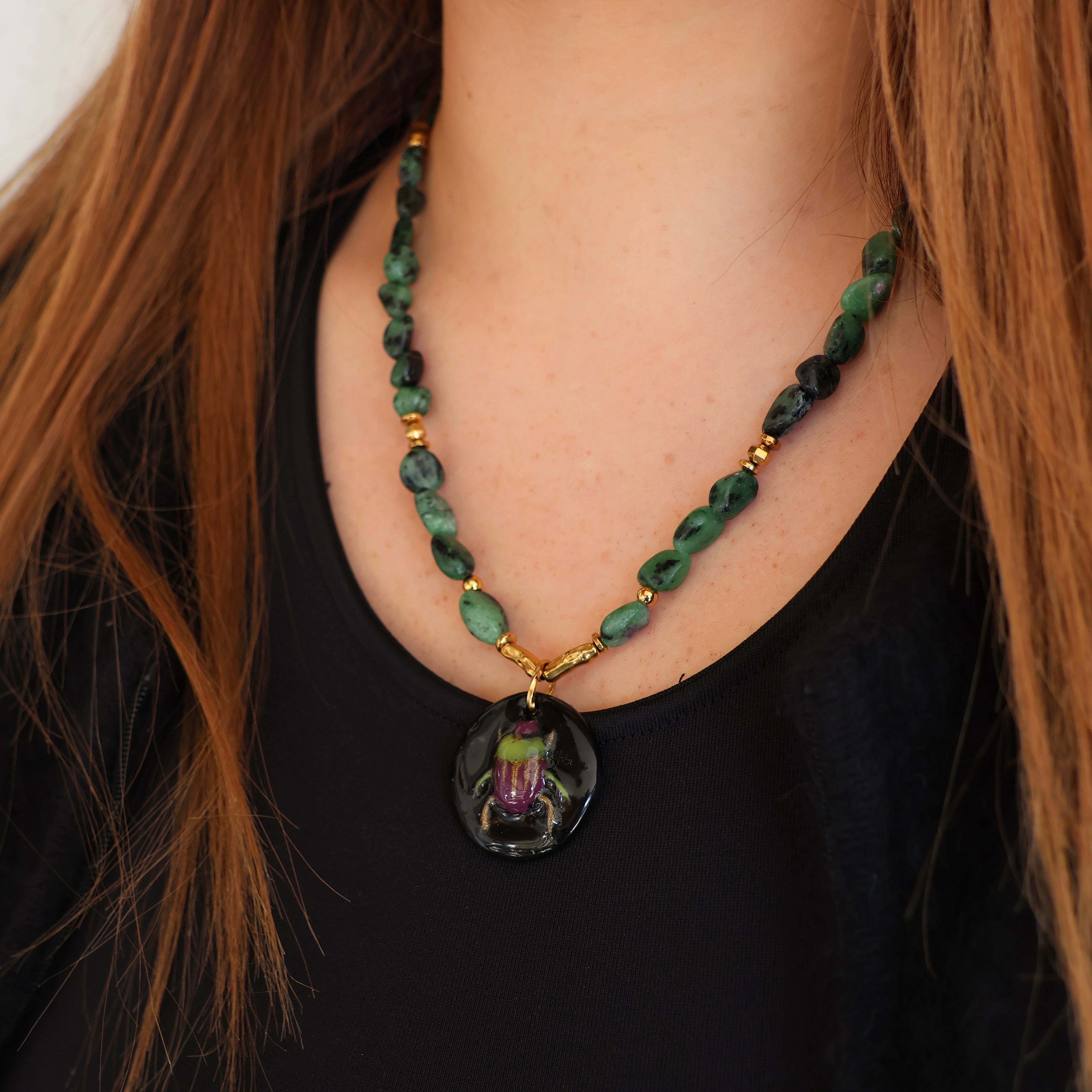 Jolil’a façonne chaque céramique à la main, donnant naissance à des formes uniques et organiques. Palo Tatouage y dépose ensuite son univers, peignant délicatement à la main les scarabées qui symbolisent la transformation et le renouveau. Enfin, Glow Designs assemble ces œuvres en bijoux, sublimant les céramiques de pierres naturelles comme l’agate indienne et l’hématite, montées sur un acier inoxydable durable.Le rubis zoisite renforce le système immunitaire, stimule la fertilité et favorise la réalisation de soi.