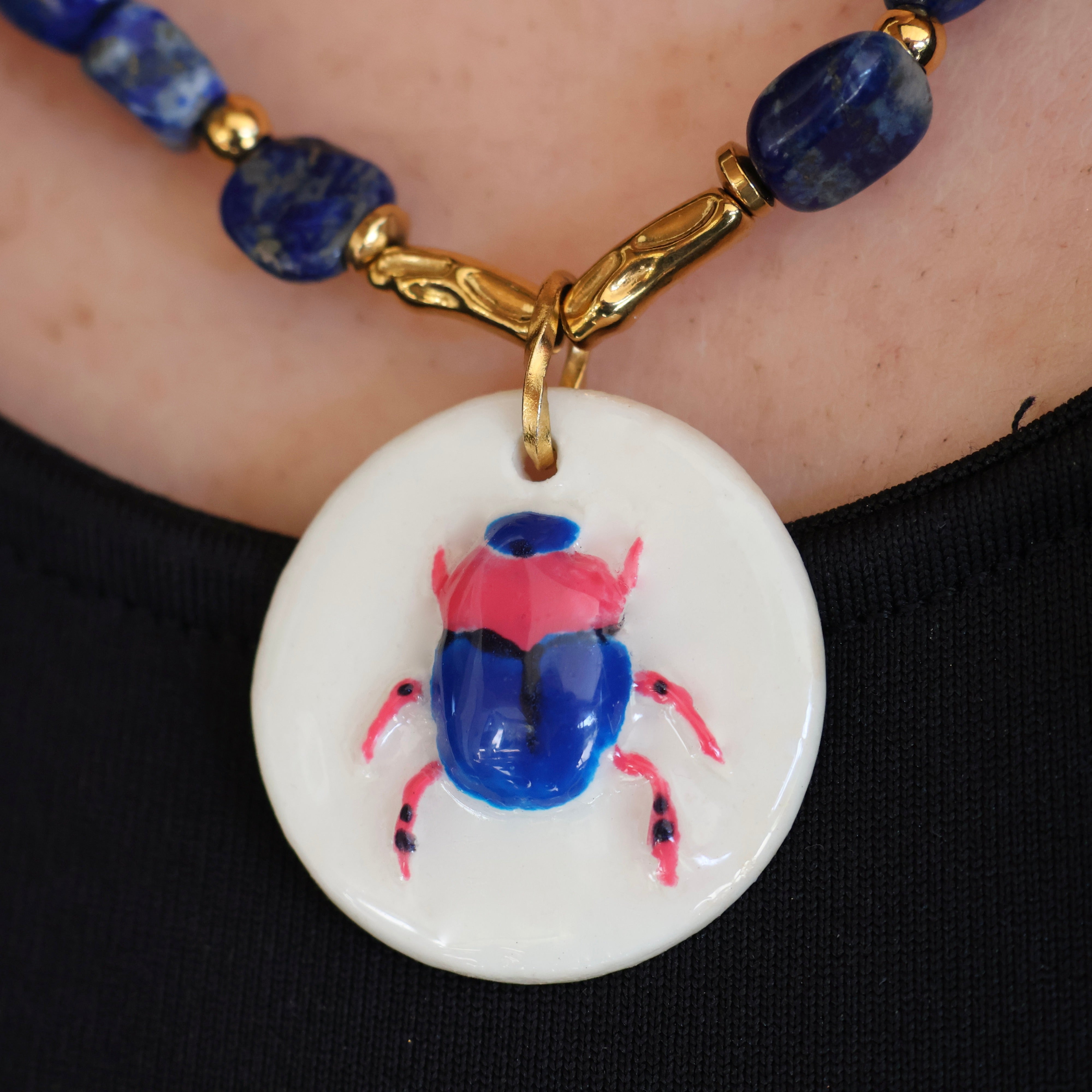 Jolil’a façonne chaque céramique à la main, donnant naissance à des formes uniques et organiques. Palo Tatouage y dépose ensuite son univers, peignant délicatement à la main les scarabées qui symbolisent la transformation et le renouveau. Enfin, Glow Designs assemble ces œuvres en bijoux, sublimant les céramiques de pierres naturelles comme l’agate indienne et l’hématite, montées sur un acier inoxydable durable.