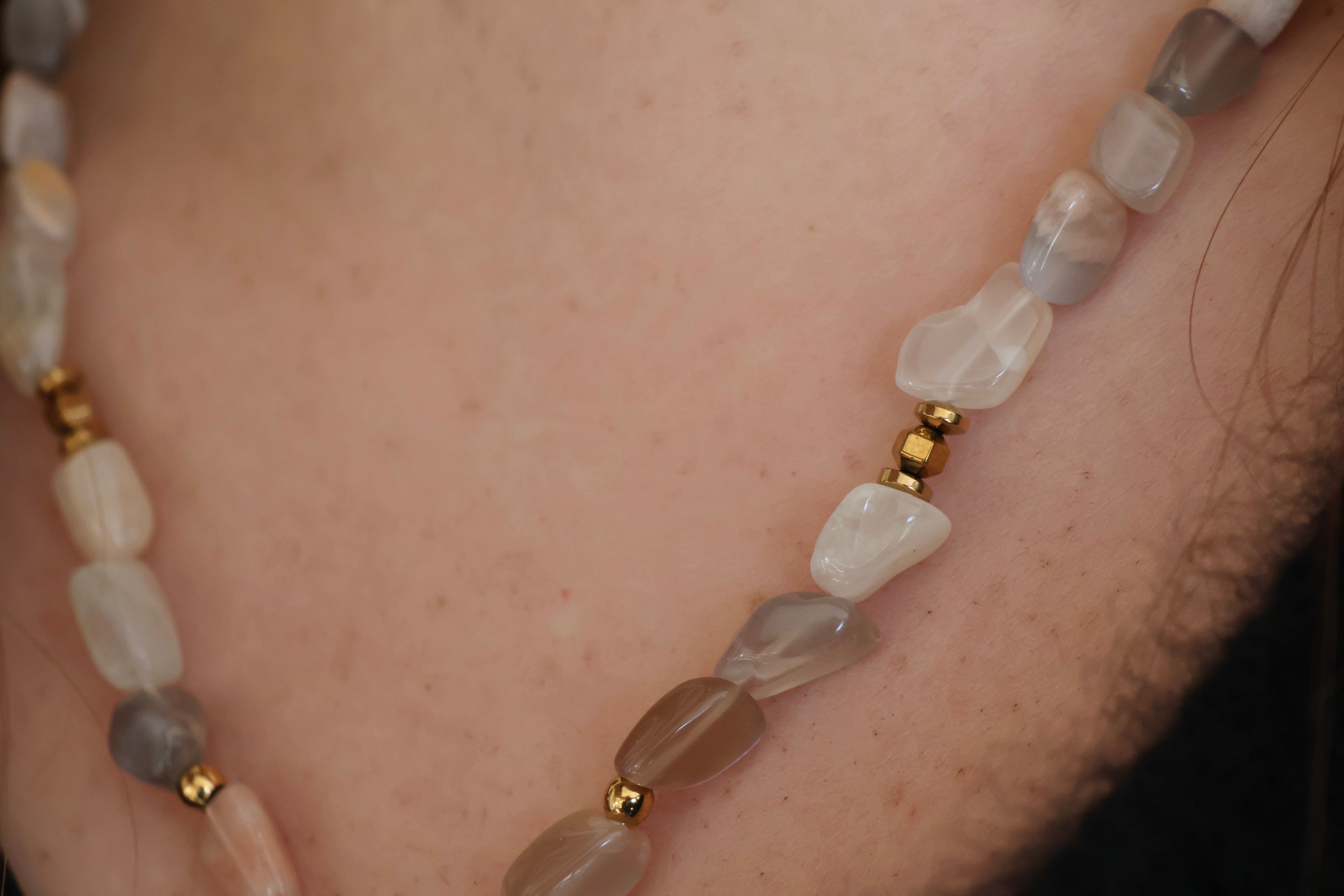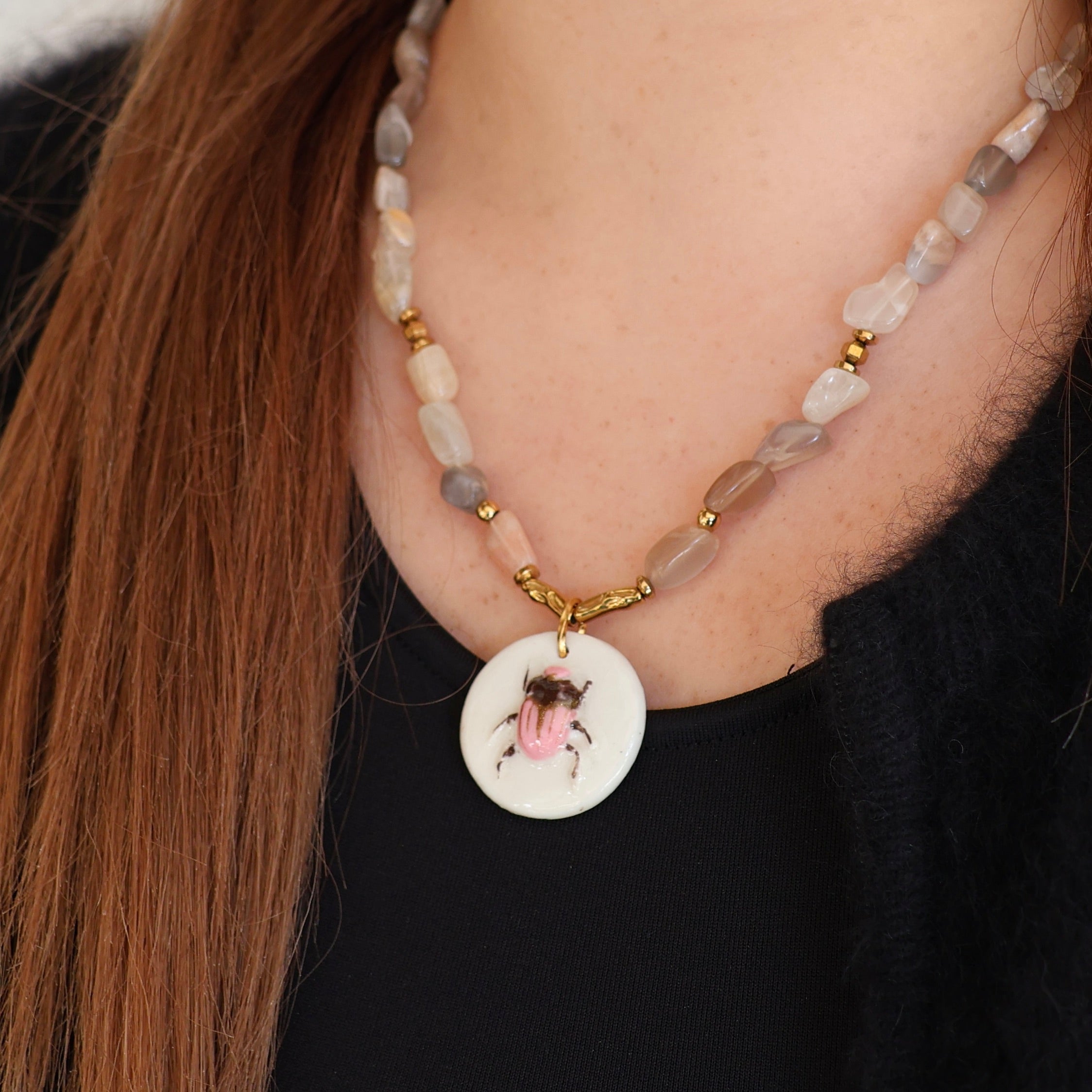 Jolil’a façonne chaque céramique à la main, donnant naissance à des formes uniques et organiques. Palo Tatouage y dépose ensuite son univers, peignant délicatement à la main les scarabées qui symbolisent la transformation et le renouveau. Enfin, Glow Designs assemble ces œuvres en bijoux, sublimant les céramiques de pierres naturelles comme l’agate indienne et l’hématite, montées sur un acier inoxydable durable.